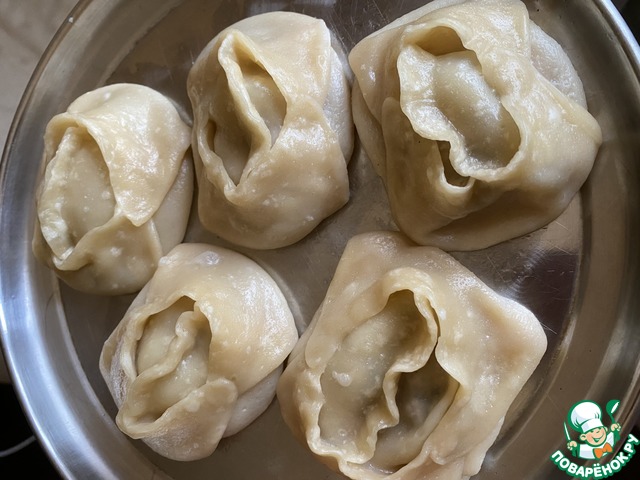 А вот обжаренные манты, приготовленные на пару с использованием кастрюли и тарелок. Я сильно обжарила манты, но это, скорее, прихоть. Так как манты нужно лишь слегка, буквально несколько секунд обжарить в сильно разогретом масле до появления лёгкой светлой корочки, этого достаточно, чтоб манты не прилипли друг к дружке при приготовлении на пару.