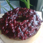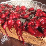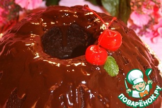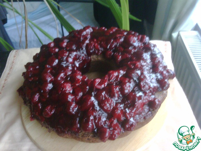 Покройте кекс вишневой заливкой. Если заливка успеет застыть, подогрейте ее снова. -