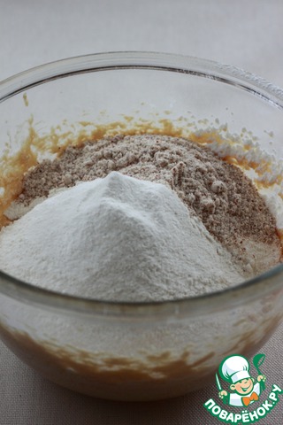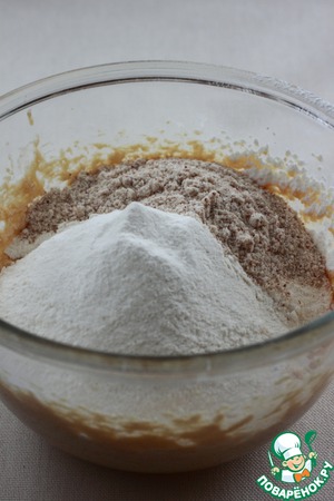 Добавить муку, смешанную с разрыхлителем, и миндальную пудру, смешать до объединения ингредиентов.