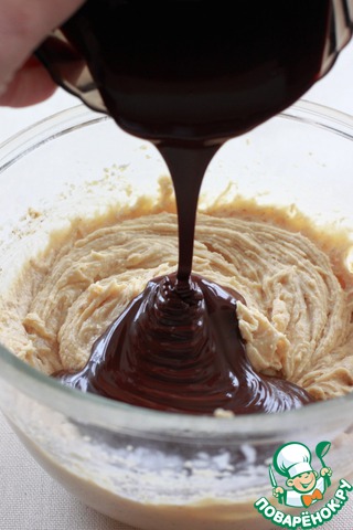 Черный шоколад растопить при помощи водяной бани или микроволновки, ввести в готовое тесто, аккуратно смешать все в последний раз.