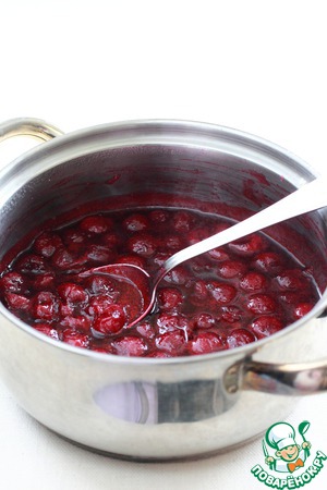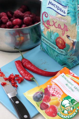 Пока печется кекс, приготовьте вишневую заливку. Порежьте мелко половинку чили, приготовьте вишню, коричневый сахар и пектин. Вместо пектина я использовала Желфикс. С чили будьте аккуратны. Встречаются такие ядреные сорта перца, что даже трети стручка может оказаться многовато. Острота чили во время термической обработки немного теряется, но все же количество перца подбирайте для себя индивидуально - методом пробы.