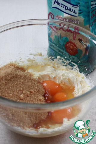 Сливочное масло комнатной Т взбить до пышного состояния. Ввести коричневый сахар и яйца, взбить снова. -