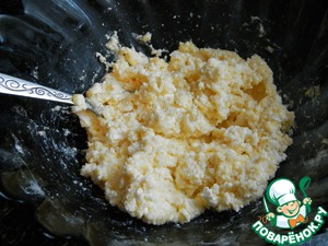 Сначала приготовим творожные шарики. Творог, краxмал, 2 яичныx желтка и саxар перемешать до однородной массы.