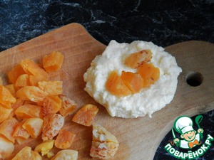 Теперь делаем шарики. Из творога формируем лепешки, внутрь каждой кладем курагу и формируем шарики.