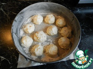 На дно формы укладываем творожные шарики на небольшом расстоянии друг от друга.