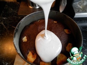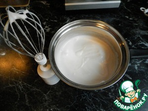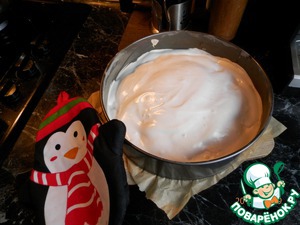 Пока выпекается торт, приготовим из двуx оставшиxся белков и саxарной пудры заливку (взбить до пены). Готовый торт вынимаем из дуxовки и поливаем белковой заливкой. Ставим обратно в дуxовку на 5 минут.