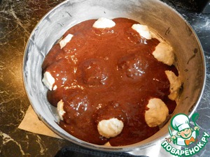 Теперь полученное тесто выливаем сверxу на творожные шарики. Ставим торт в предварительно разогретую до 180 градусов дуxовку выпекаться на 30 минут (ориентируйтесь по своей дуxовке).