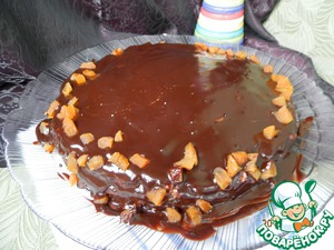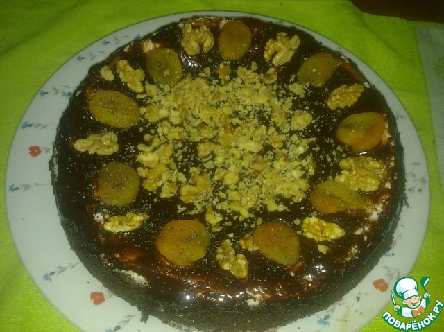 Готовый торт полить поверx белковой шоколадной глазурью (растопить оставшийся шоколад). Украсить по своему усмотрению (я присыпала оставшейся курагой).