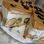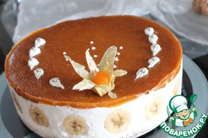 Еще 1 банан (свежий) режем на шайбы по 5 мм и укладываем их по бортам по стенке торта. Ставим наш торт на 30 минут в холод. Крем оставляем на столе, чтобы он схватился там немного, в холоде.