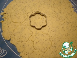 Охлажденное тесто раскатываем толщиной около 3-х мм, поверхность стола немного посыпаем мукой. Вырезаем печенье с помощью вырубки (у меня цветок) или стакана.