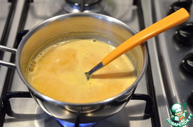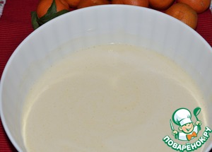 Соединить желтки с остывшим мандариновым соком, затем добавить сливки и в последнюю очередь белки.
