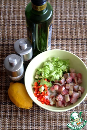 Добавить к овощам сельдь. Заправить оливковым маслом, соком лимона, посолить, поперчить свежемолотым черным перцем.