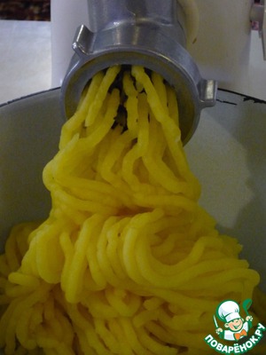 Пропустить отваренный и чуть остуженный картофель через мясорубку с мелкой сеткой.