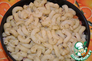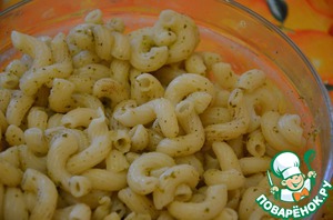 Макароны варим в подсоленной воде, откидываем на дуршлаг. Затем, если нужно, еще солим, перчим, добавляем песто. Сыр трем на терке и половину добавляем в макароны (у меня в этот раз сыра оказалось мало, поэтому макаронам его не досталось)).