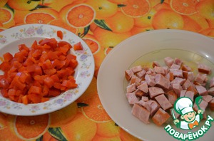 Перец мелко режем и пару минут обжариваем в небольшом кол-ве масла.