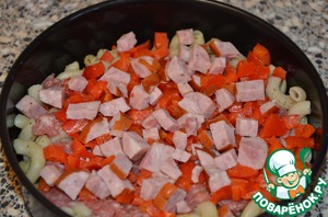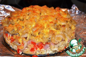 Форму диаметром 20-22 см смазываем маслом, выкладываем половину макаронов. На макароны кладем половину фарша.