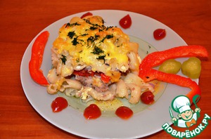 Через 20 мин. заливаем запеканку соусом, снова накрываем и запекаем еще минут 15.