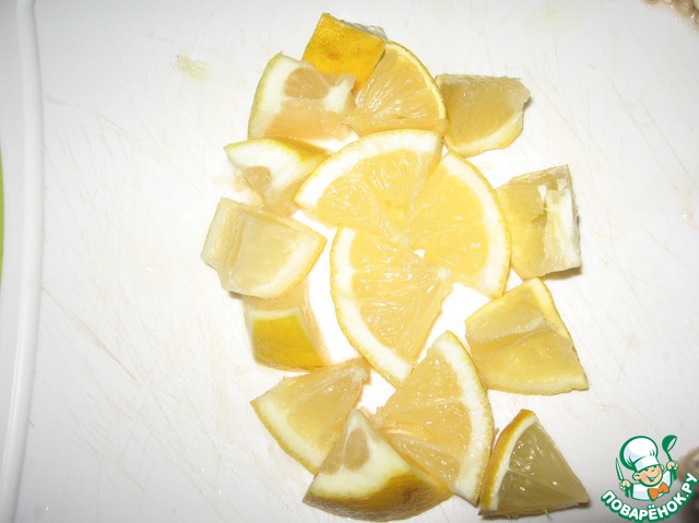 Теперь приготовим крем, пока наши коржи остывают. Берем 1-1.5 лимона и заливаем их кипятком, чтобы убрать горечь. Через минут 10-15 нарезаем лимон так, чтобы мы смогли удалить все косточки-кружочками, а потом перерезаем их на 4-6 частей.