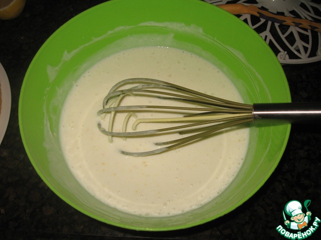 В миску положить сметану, сахар - 1 ст. (можно и на свой вкус) и наш измельченный лимон и хорошо взбить венчиком, или миксером.