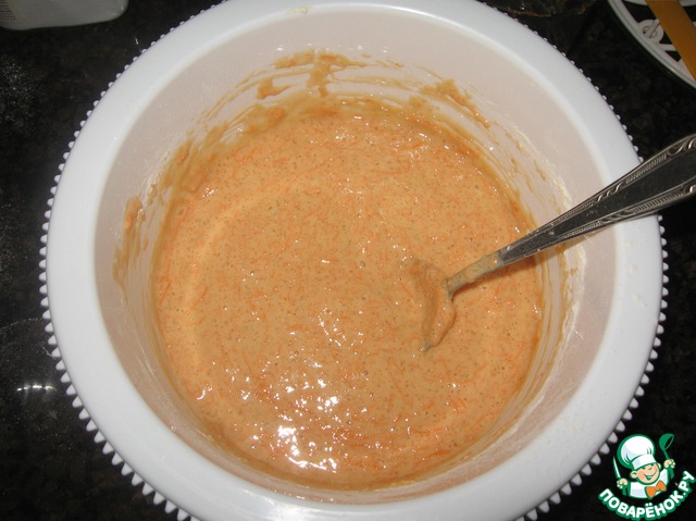 Добавляем натертую морковку и хорошо перемешиваем ложкой.