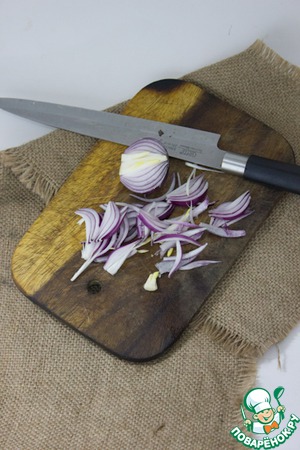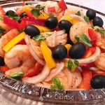 Перец нарезать тонкими полосками. Креветки очистить от панциря, мелко нарезать. Несколько штук оставьте целиком с хвостиком для украшения.