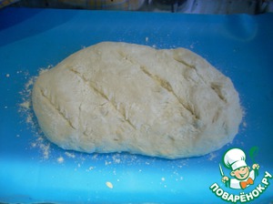 Стол присыпаем мукой. Тесто надо немного помять, потом придать ему форму, которую вам подскажет ваша фантазия. Я сделала что-то вроде батона.