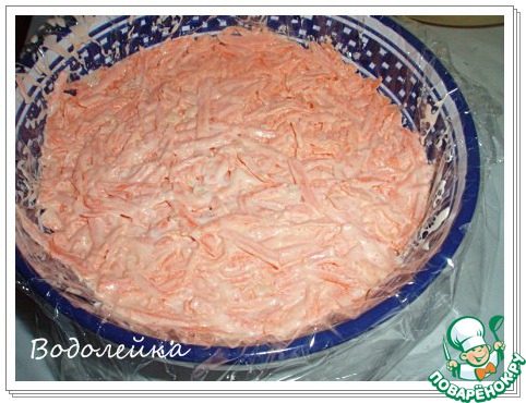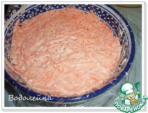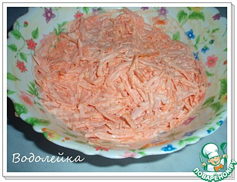 На терке натираем сырую морковь, добавляем чеснок (по вкусу) и майонез. Перемешиваем. -