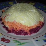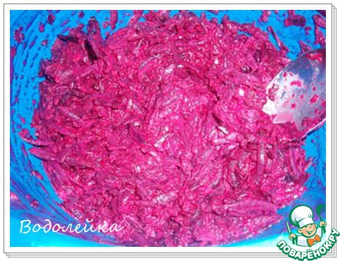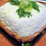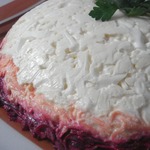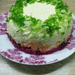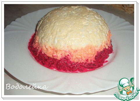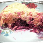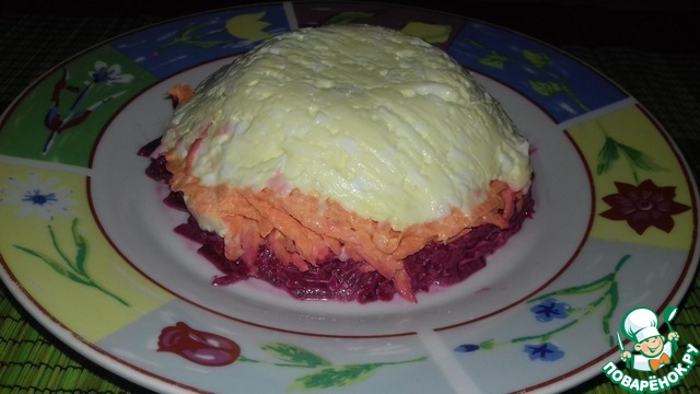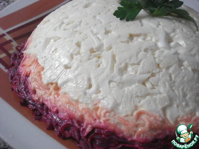 Делать такую закуску желательно незадолго до подачи, т. к. слой со свеклой немного капризный (может дать "сок").