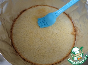 • Затем выкладываем белый бисквит, также смачиваем сиропом и выкладываем оставшийся мусс.