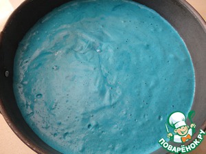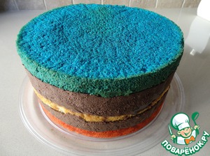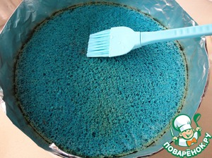 • Сверху накрываем синим бисквитом, промакиваем его сиропом. Ставим торт в холодильник. На следующий день его можно будет украсить.