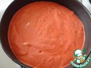 • В очень высокую форму (я свою нарастила фольгой) кладем красный бисквит, смачиваем его сиропом и выкладываем сверху половину мусса.