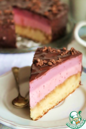 Бисквит охладить, перевернуть дном в верх, поместить в разъёмную форму. Пропитать любым сиропом. Сверху вылить малиновую массу. Поместить в холодильник примерно на 30-40 минут, за это время суфле "схватится".