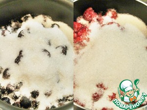 В малину добавить 6 ст. л. сахара, в смородину 4-5 ст. л. сахара. Довести до кипения и немного прокипятить.