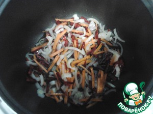 В то время пока варятся ребра, в чаше мультиварки на программе "Жарка" или "Выпечка", на растительном масле обжариваем лук, морковь и свеклу минут 10-15.