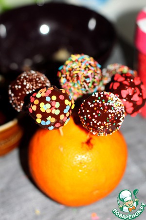 Затем шарик из теста накалываем на зубочистку и начинаем окунать в шоколад. Ждем, пока лишний шоколад стечет, затем посыпаем конфету украшением и втыкаем в апельсин.
