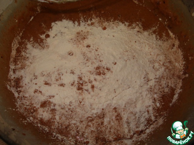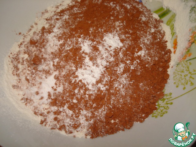 В миске просейте вместе муку, какао-порошок, порошок выпечки, соду и соль. -