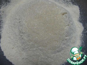 1. Муку просеять в миску и смешать с сахаром (по рецепту 50 г, и выходит не очень сладко, кто любит послаще, кладите 100 г) и солью.