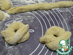7. Его еще раз вымесить, подсыпая муку. Разделить на 12-14 частей и из каждой скатать колбаску длиной 20-30 см и сформовать крендельки, как на фото.