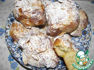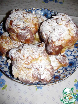 8. Противень застелить бумагой для выпечки, желтки смешать с 1 ст. л. молока и смазать крендельки. Сверху посыпать миндальными лепестками.
