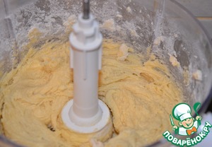 Холодное масло растираем со стаканом муки, добавляем сахар, яйца, ванильный сахар, остальную муку с разрыхлителем. Я все это дело доверила комбайну.