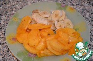 Бананы режем кружочками, хурму чистим и режем дольками.