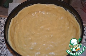 Достаем тесто из холодильника. Для раскатывания оно было слишком хрупкое, поэтому я его распределила по форме (22 см диаметром) руками. Сделала бортики. Дно формы я застелила пергаментом, бока смазала маслом.