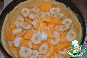 На тесто кладем фрукты. У меня хурма была терпковатая, поэтому я сверху еще присыпала фрукты 1 ст. л. сахарной пудры.