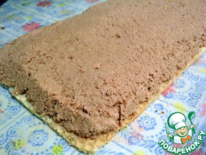 Накрываем вторым коржем, прижимаем, стараясь, чтобы высота заготовки была одинакова по всей длине, подравниваем бока. Ставим полученную заготовку в холодильник на 20 минут.