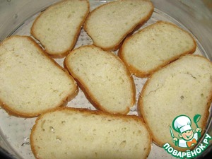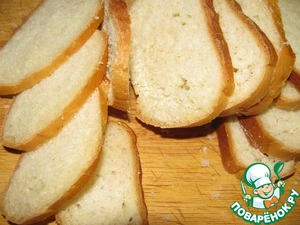 Хлеб нарезать ломтиками 0,5 см толщиной. Сразу скажу, что я делала ее в первый раз, поэтому брала 1/2 нормы ингредиентов, но у меня вышла совсем не маленькая запеканка, которая поместилась в форме диаметром 26 см, а в рецепте используется форма с диаметром 28 см.