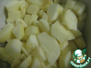 Приготовить яблочное пюре: яблоки очистить от шкурки и от семян, мелко нарезать и потушить минут 5-10 в кастрюле, добавив ром (апельсиновый сок), корицу и немного сахара (все зависит от сладости яблок). Готовую массу измельчить блендером.