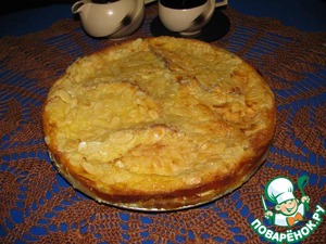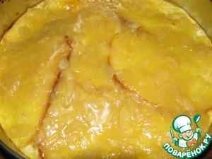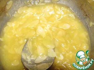 Пока запеканка печется, приготовим миндальную заливку. Сливочное масло соединить с оставшимся сахаром (75-80 г), сливками, мукой и миндалем. Довести до кипения и снять кастрюлю с плиты.