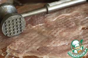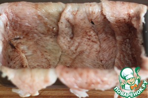 Филе нарежем вдоль длинными тонкими ломтями, накроем пищевой пленкой и отобьем с одной стороны.