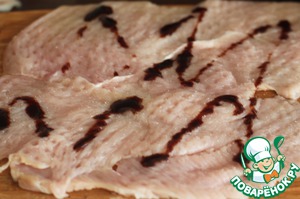 Нанесем на кусочки индейки бальзамический уксус, распределив его кулинарной кистью по всей поверхности. Добавим соль и перец по вкусу.