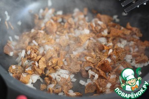 Мелко нарежем луковицу и обжарим ее с грибами в сливочном масле. Здесь нужно сказать, что на 100% я не помню, какие именно были грибы в рулете, но цвет был максимально приближен к лисичкам. Если у Вас нет лисичек - не проблем, подойдут любые другие грибы, единственное, не будет такого яркого перехода.